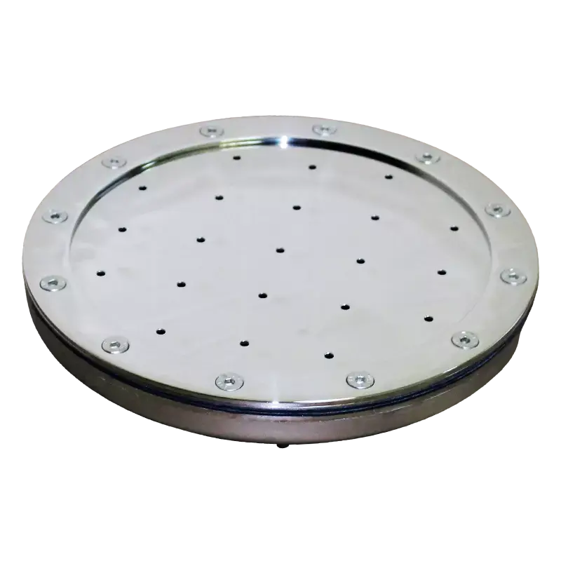 The aeromassage system (pool geyser) consists of a grid—an aeromassage plateau—built into the bottom of an artificial pool. Aeromassage geysers, loungers, and nozzles create a massage effect in the pool using fine air bubbles. The system operates by pumping air into the system, which is then released under pressure from nozzles located on the bottom. These geysers are suitable for installation in tiled, liner, and composite pools. Geysers are made of AISI304 stainless steel, with mirror-finished faces. We can also manufacture them in AISI316L steel.