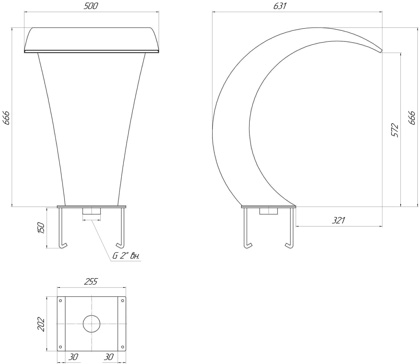 "Cone" - a concentrated, directional stream "Slot" - a flat stream "7 Holes" - a diffused shower with multiple jets The cannon's body is designed as a curved stand rising above the edge of the pool. Interchangeable nozzles attach to the end of the spout and are easily replaced by hand. This allows you to adapt the attraction to various use cases, from active recreation to relaxing swimming.