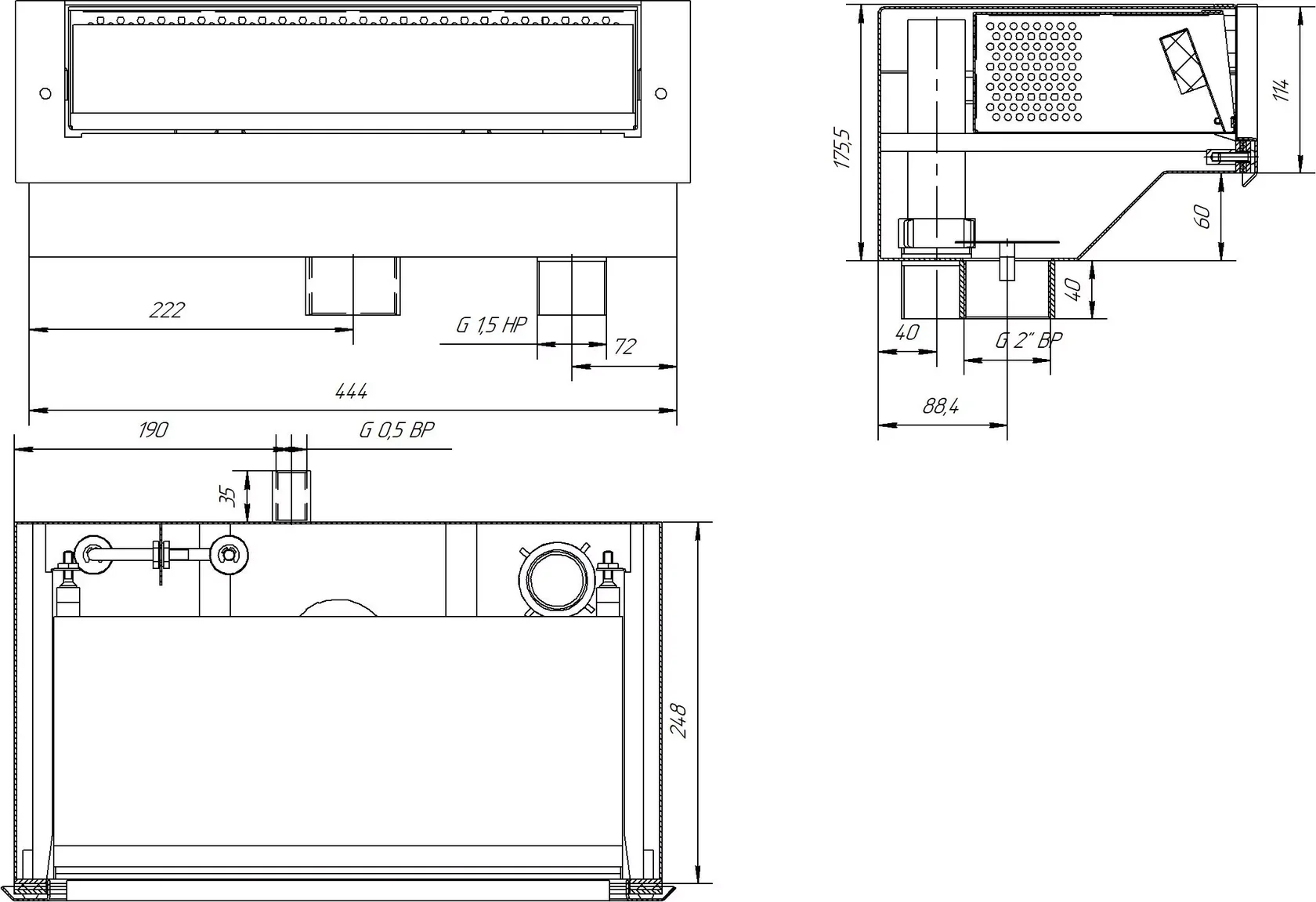 It is designed to collect floating debris (leaves, hair, insects, etc.) from the surface of the water. Several versions are available: wide-sided, narrow-sided, and with a water filler and overflow level. The front parts are polished. A coarse filter is included. We can also manufacture skimmers in AISI316L steel.